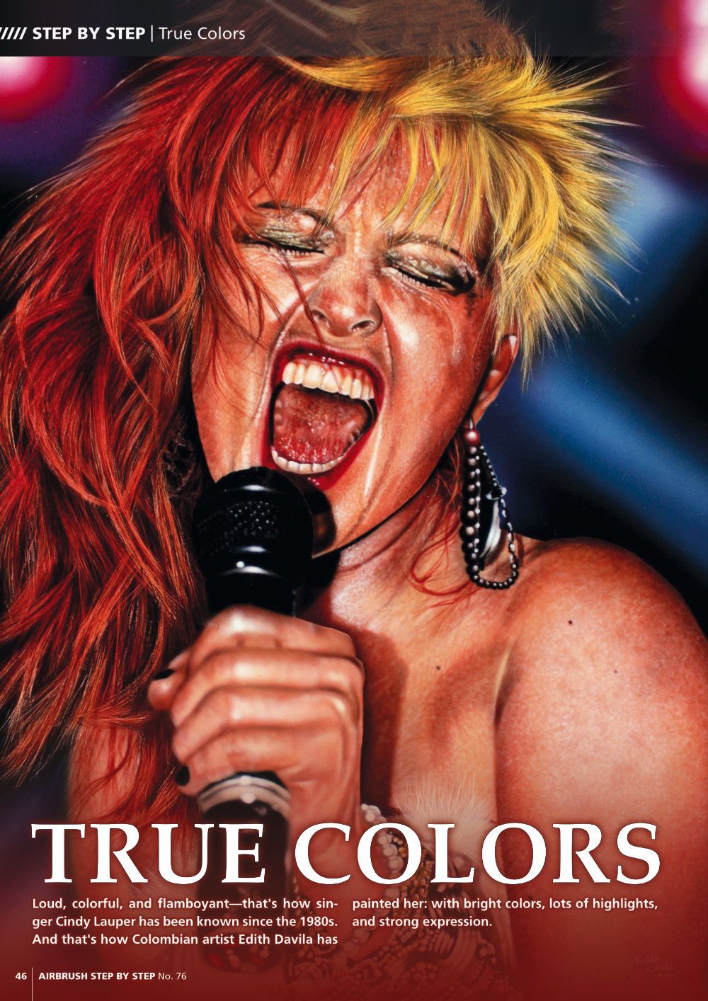 Colombian artist Edith Davila has painted 80s star Cindy Lauper with bright colors, many highlights and strong expression.