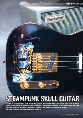 Polish artist Agnieszka Maluchnik creates a harmonious electric guitar design with steampunk and gold elements.