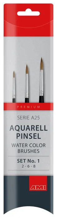 Watercolor brush series A25 SET 1, size 2, 6, 8 round artist brush with red martin hair in a seamless, silver -colored clamp with a short, matt black painted stem.