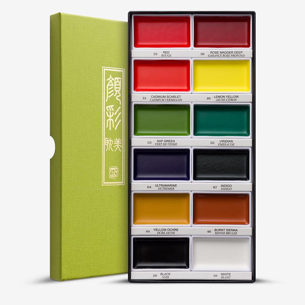 This Kuretake-Gansai Tambi Watercolour set is filled with traditional Japanese watercolours for professional artists and crafters alike. These extra large pans (4.5 x 2.5cm) are ideal for sketching, illustration, sumi-e, manga, calligraphy and more. The range includes a good selection of vivid colours with creamy consistencies. All of the colours are extremely lightfast.